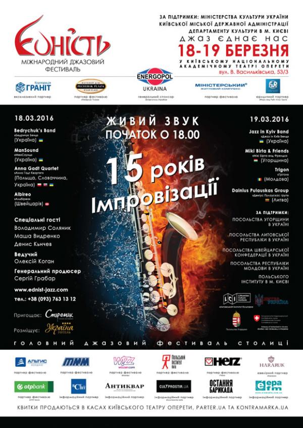 18 та 19 березня 2016 року у Київському національному академічному театрі оперети під назвою «Єдність» відбувся 15-й міжнародний джазовий фестиваль, який у цьому жанрі є найвидатнішою подією столиці України.